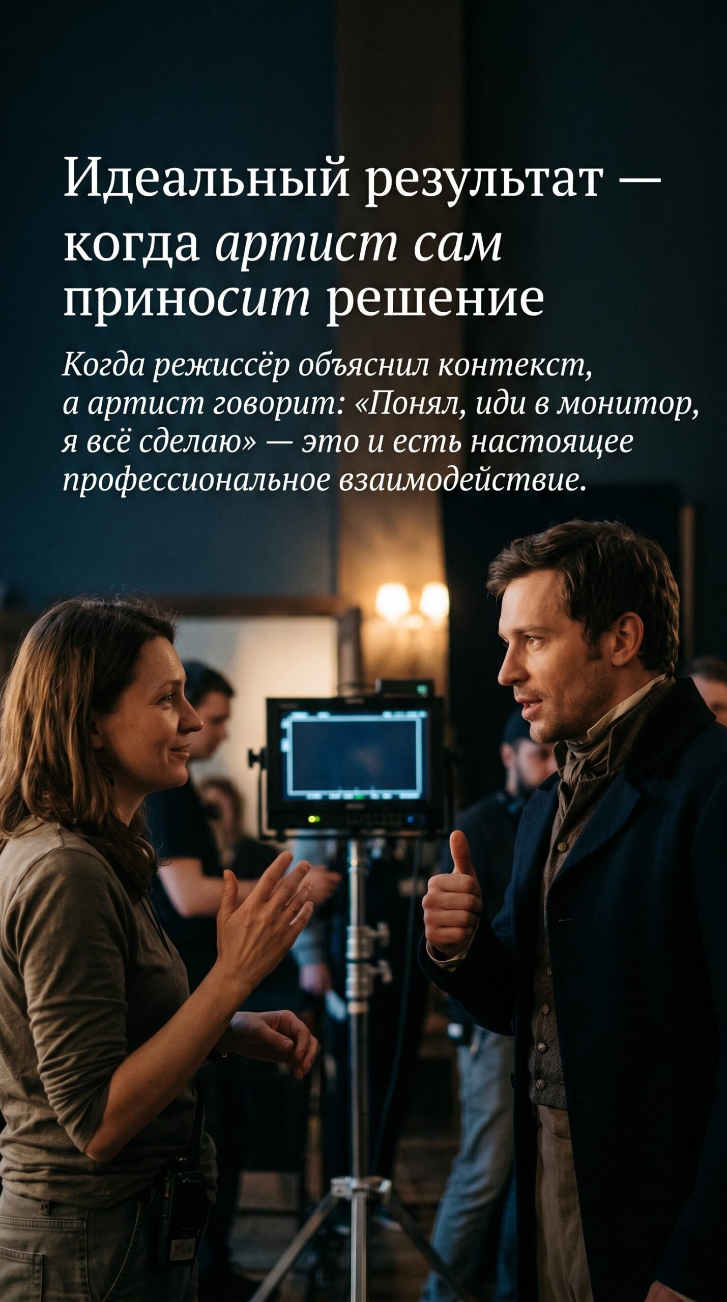 96. Идеальный результат — когда артист сам приносит решение Когда режиссёр объяснил контекст, а артист говорит: «Понял, иди в монитор, я всё сделаю» — это и есть настоящее профессиональное взаимодействие. К этому нужно стремиться.